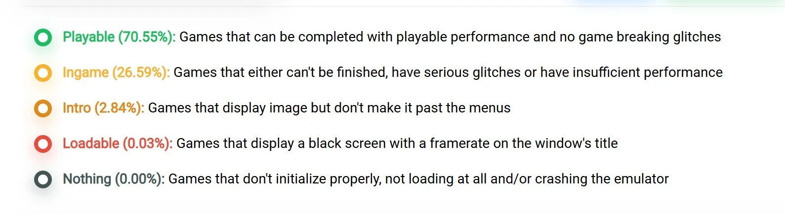 По состоянию на вторую половину января 2026 года 70,94 процента игр для PS3 имеют статус playable, то есть их можно пройти до конца без серьёзных проблем с производительностью и критических багов.