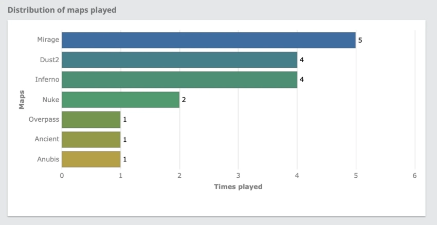 - 2-3-е места: В тройку лидеров также вошли Dust2 и Inferno. На каждой из них команды провели по 4 встречи.