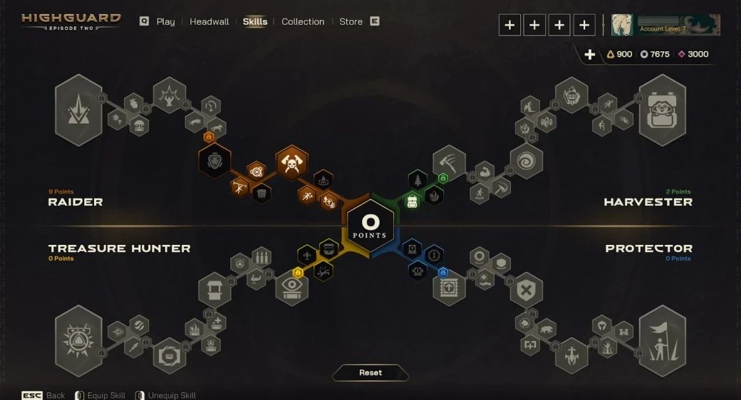• дерево навыков — позволяет развивать навыки в 4 различных стилях игры (Рейдер/Raider, Жнец/Harvester, Охотник за сокровищами/Treasure Hunter, Защитник/Protector). Можно бесплатно сбросить очки и легко «снять» любой навык;