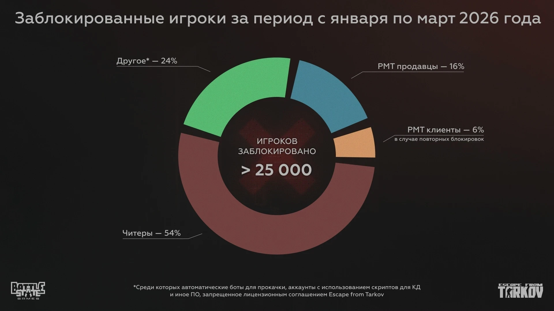 Создатели Escape from Tarkov в 2026 году забанили более 25 тыс игроков — из них лишь 54% читеры